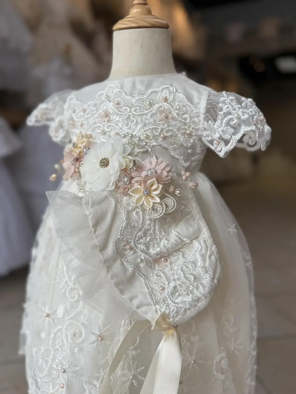 Vintage-Inspired Ivory Baptism Gown with Floral Lace and Matching Bonnet